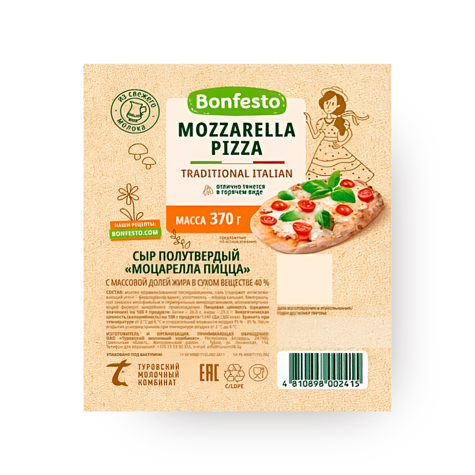 Этот сыр хорошо плавится и подходит для пиццы или других горячих блюд. В его составе есть пастеризованное молоко и бактериальная закваска.