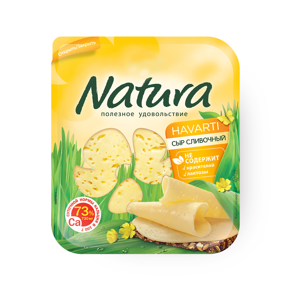 Этот сыр нарезан ломтиками, которые удобно класть на бутерброды. В нём сочетаются вкус пастеризованных сливок и нежной закваски.