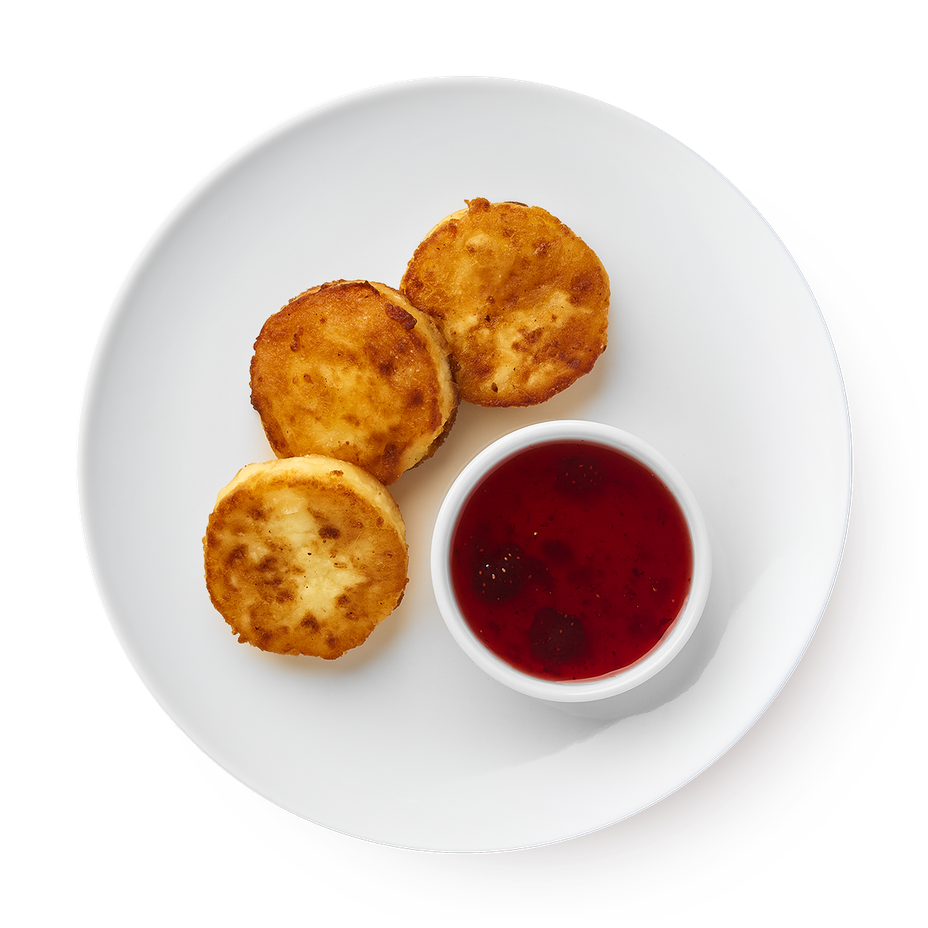 Сырник (творог, сахар, яйцо куриное, сахар ванильный, мука пшеничная, крупа манная); соус (варенье клубничное).