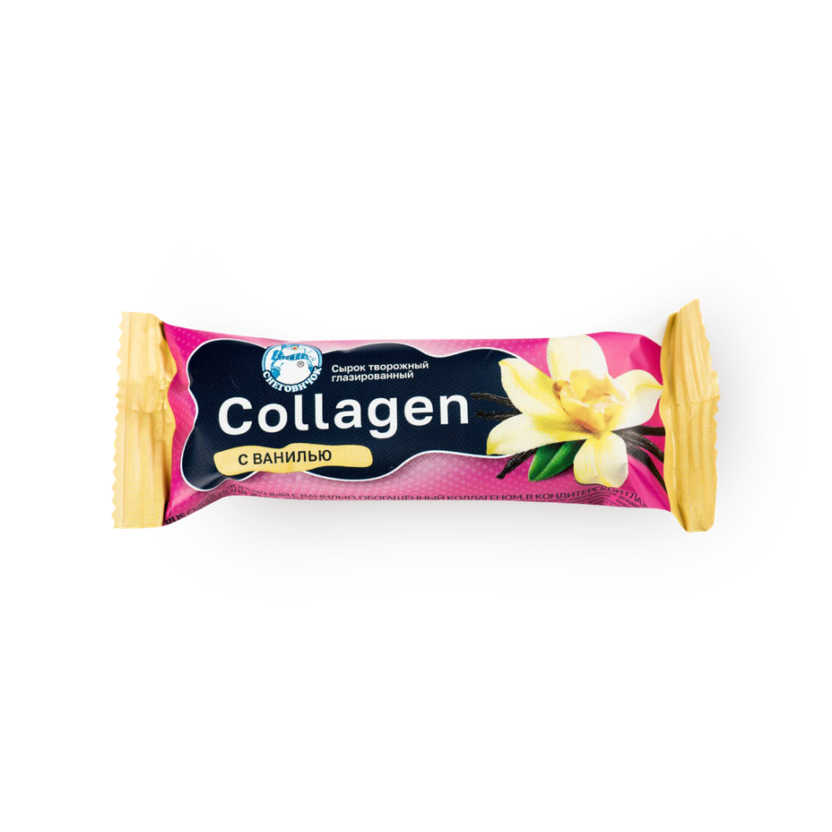 Этот сырок с ванилью покрыт кондитерской глазурью, которая сочетается с нежной творожной начинкой. В составе есть гидролизованный коллаген, который делает продукт особенным.