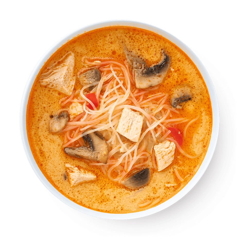 Этот суп сочетает куриный бульон с кокосовым молоком, имбирём и чили. В нём есть рисовая лапша, шампиньоны и кусочки куриного филе.