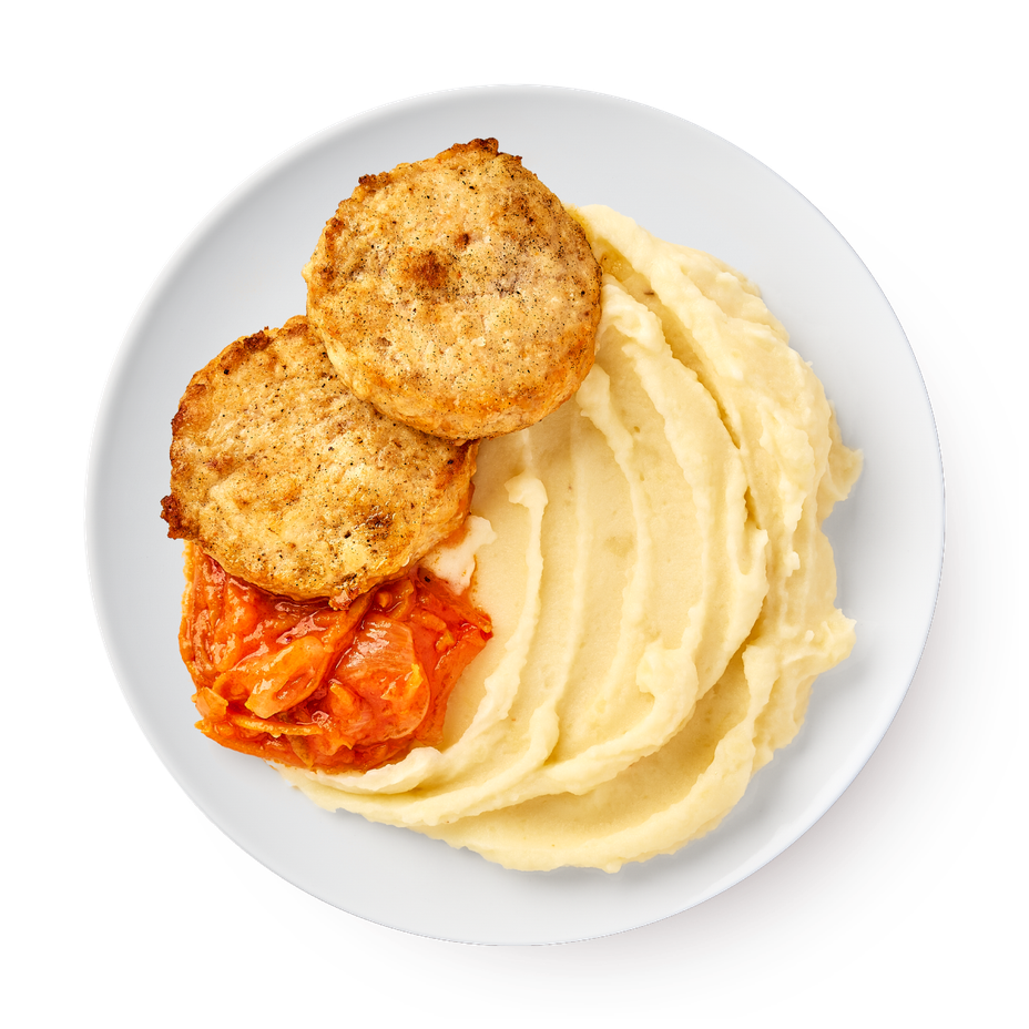 Куриные котлеты с картофельным пюре и томатной зажаркой готовы к разогреву. Это блюдо можно подать на обед или ужин.