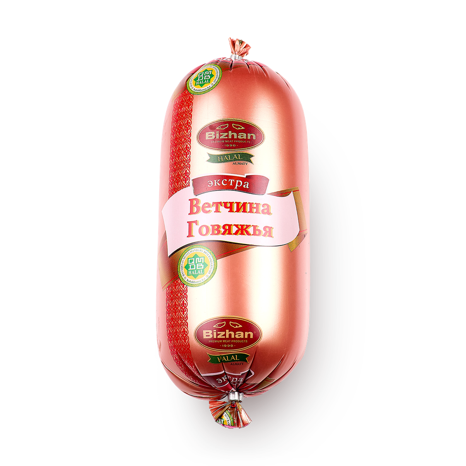 Эта ветчина приготовлена из говядины с добавлением специй, которые придают ей пряный аромат. Её можно нарезать для бутербродов или добавить в салат.