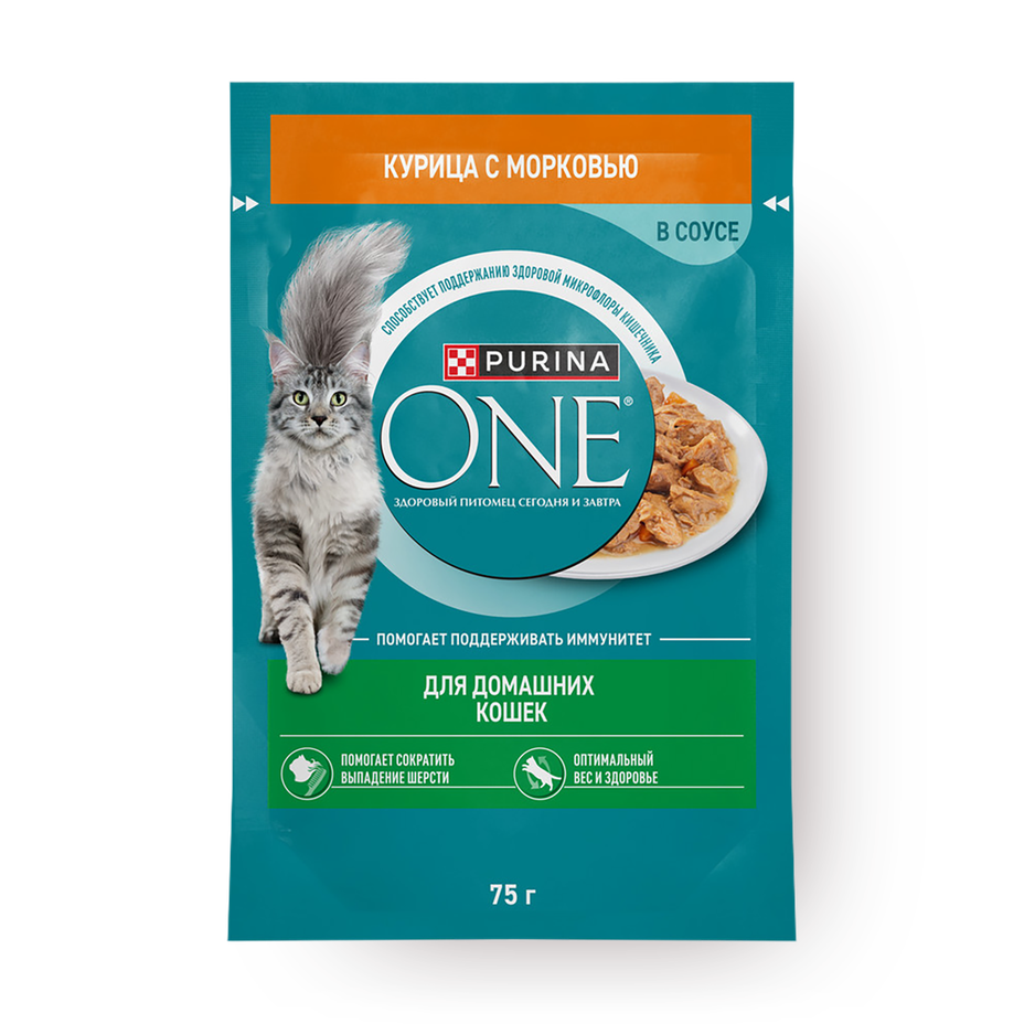 В этом корме сочетаются курица и морковь. Он подходит взрослым кошкам в качестве основного питания.