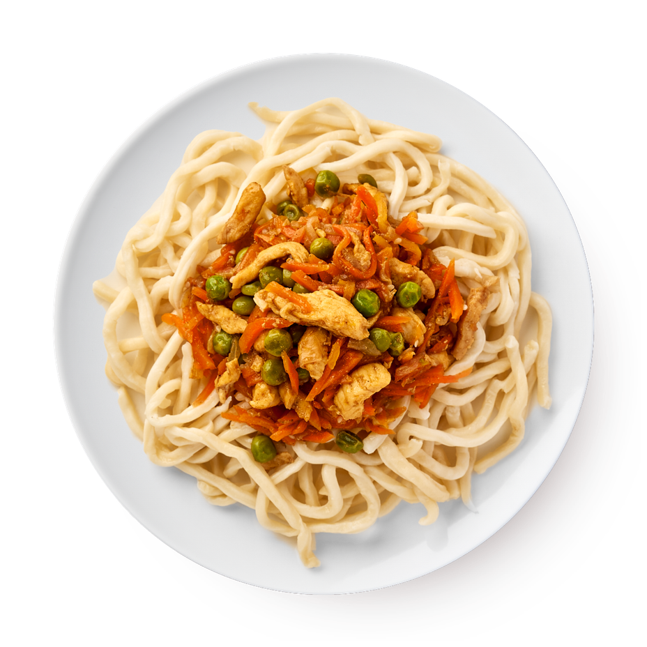 Эта лапша с курицей и овощами приготовлена с соевым и терияки соусами. Можно разогреть в микроволновке или на сковороде.